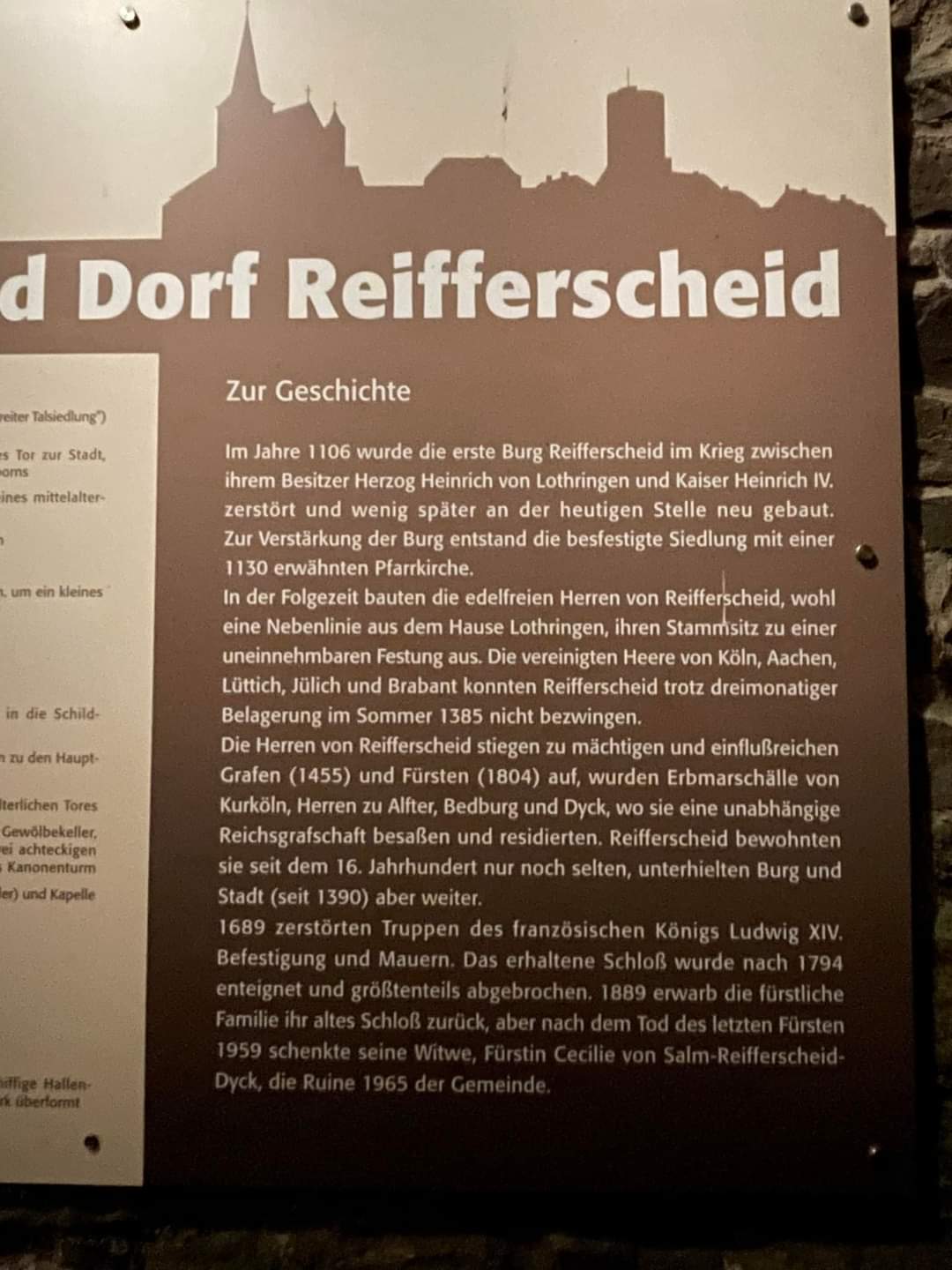 Im selben Jahr zerstörte der Herzog von Niederlothringen aufgrund eines Streits zwischen Kaiser Heinrich IV. und König Heinrich V. seine Burg in Reifferscheid.